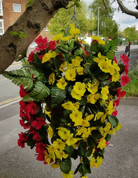 Cesta colgante artificial Flores de jardín Hojas de hiedra Helecho Follaje Rosa