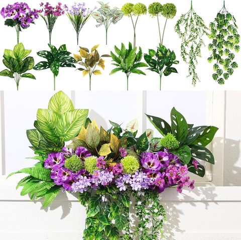 18 Uds plantas artificiales flores arbustos vegetación mixta tallos arbustos de imitación para caja de ventana jardín Patio porche delantero decoración de patio