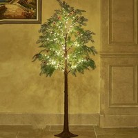 Árbol de pino iluminado con vegetación artificial con bayas rojas, luces de hadas blancas cálidas para Navidad, vacaciones, hogar, decoraciones para chimenea